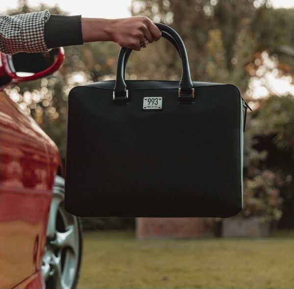 borsa da lavoro elegante caratterizzato da una linea semplice e pulita, prodotto con pellame rigenerato, fodera interna in fantasia pied de poule ispirata alle autovetture di lusso anni ‘60.
