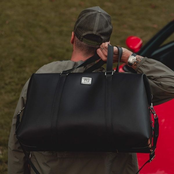 È dotato di due fasce laterali regolabili con i gemelli, per gestire la capienza del borsone in base al carico. al suo interno si trova una tasca con lampo, e dei passanti per alloggiare la nostra cintura 993 compresa nel borsone. Al suo interno è presente anche la tracolla realizzata con la cintura di un auto.