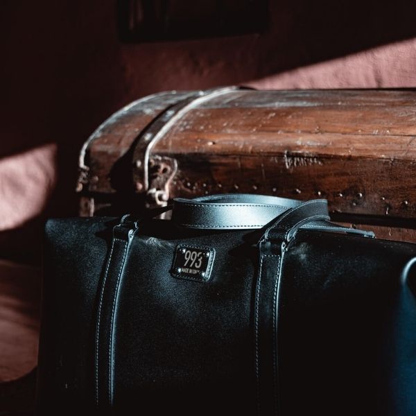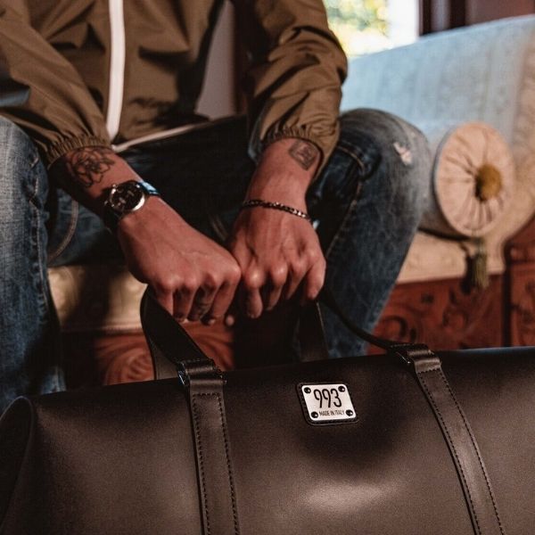[vc_row][vc_column][vc_column_text]Borsone da viaggio elegante caratterizzato da una linea semplice e pulita, prodotto con pellame rigenerato, fodera interna in fantasia pied de poule ispirata alle autovetture di lusso anni ‘60.