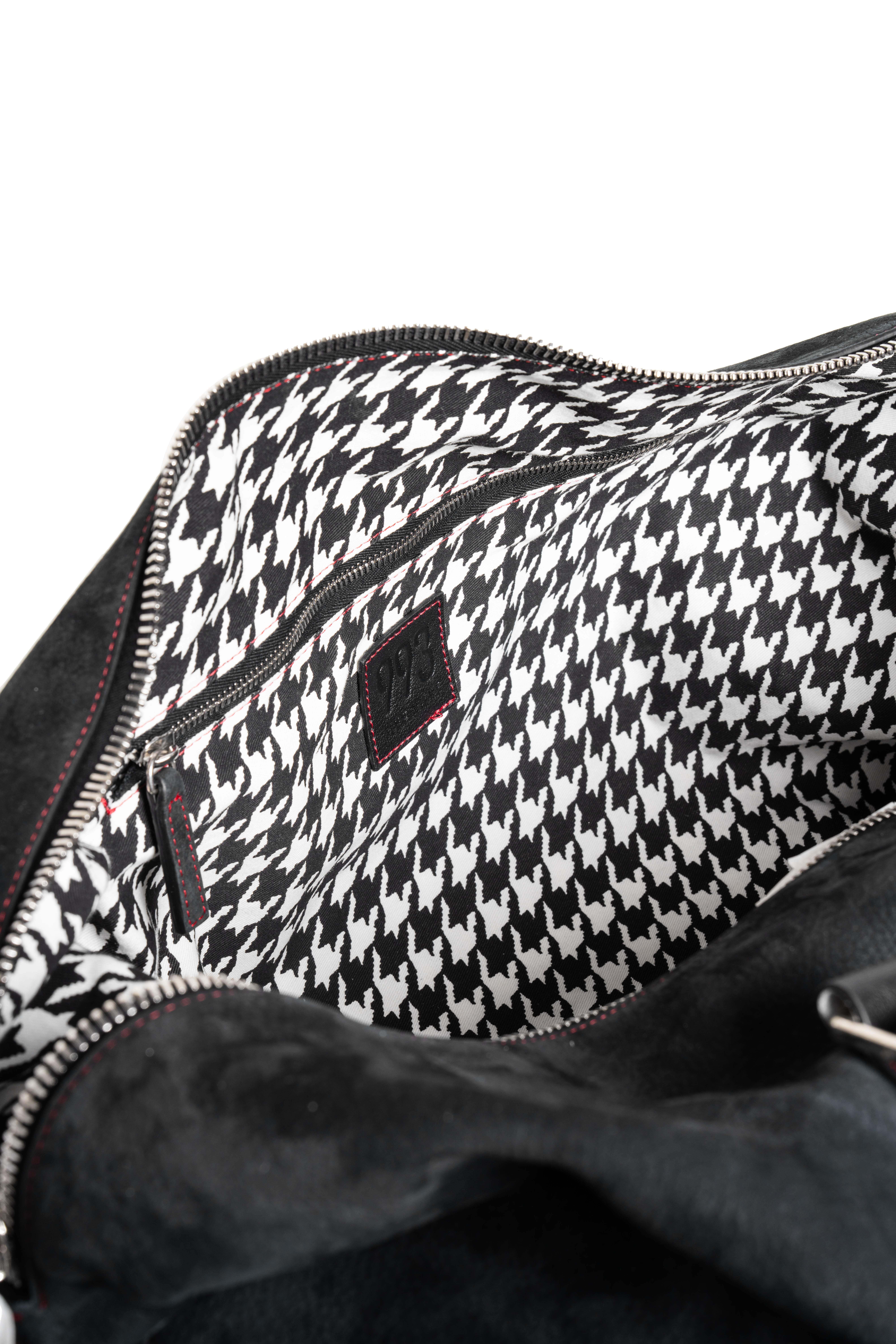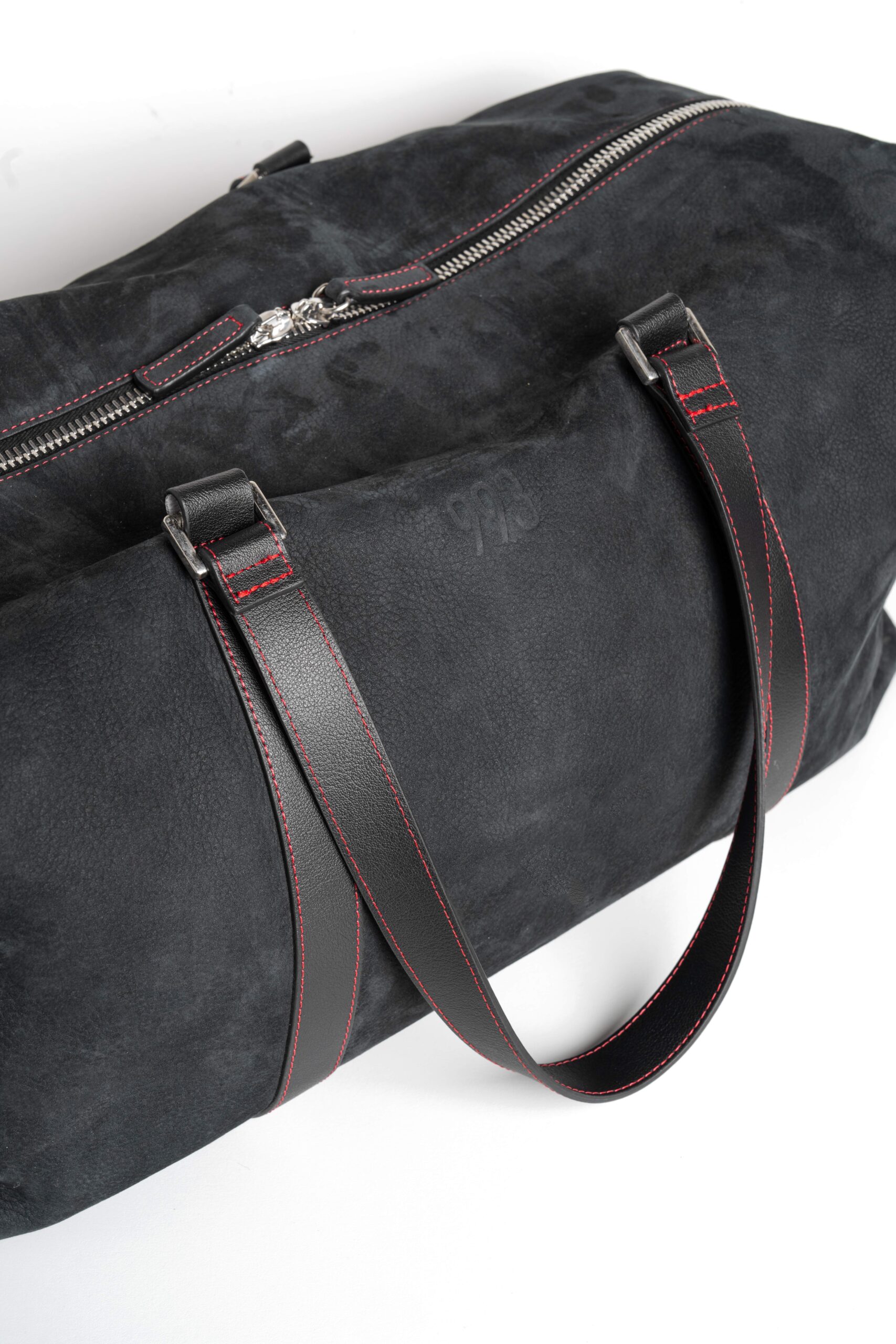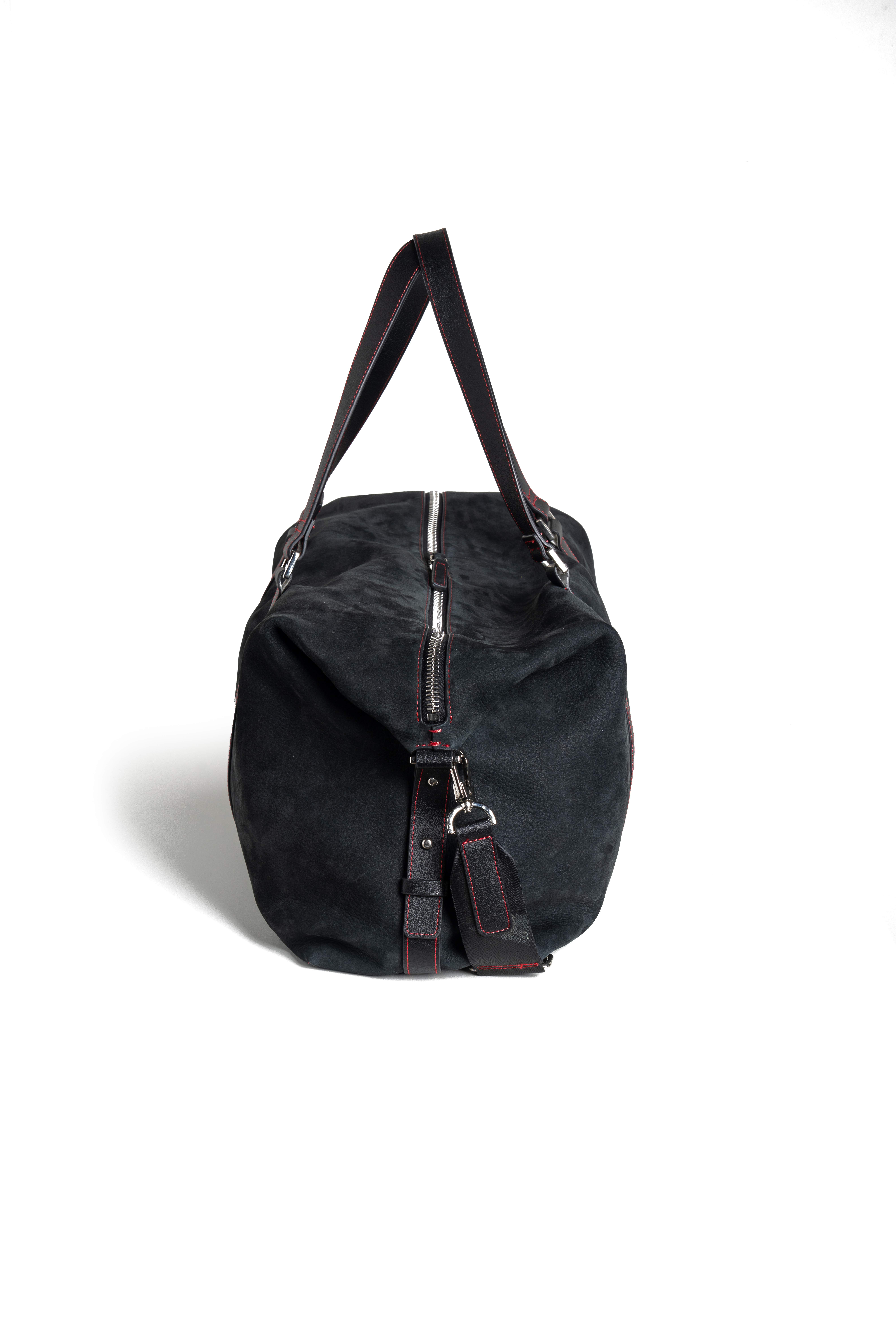 Borsone da viaggio dal design raffinato, definito da linee essenziali e pulite. Realizzato con due pregiate tipologie di pellame: il nabuk scamosciato di alta qualità, morbido al tatto e dall’aspetto opaco, e un pellame rigenerato di prima scelta, selezionato per garantire resistenza e sostenibilità. L’interno è foderato in tessuto pied de poule 100% cotone, ispirato agli interni delle autovetture di lusso degli anni ’60.   Le cuciture rosse a contrasto sul pellame nero rappresentano la cifra distintiva della collezione GT Line, richiamando lo spirito sportivo ed elegante del mondo automobilistico. È dotato di due fasce laterali regolabili con gemelli, che permettono di modulare la capienza in base al carico. All’interno si trova una tasca con chiusura a lampo e una tracolla rimovibile, realizzata con una cintura automobilistica, elemento iconico che coniuga stile e funzionalità.
